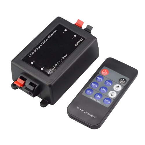 Input voltage: DC 12-24V Output current: 4A Max per channel Total output power: 144W Max (at DC 12V) or 288W Max (at DC 24V) Compatible with SMD 5050 and 3528 RGBW LED strip lights 11-key infrared remote control for easy operation